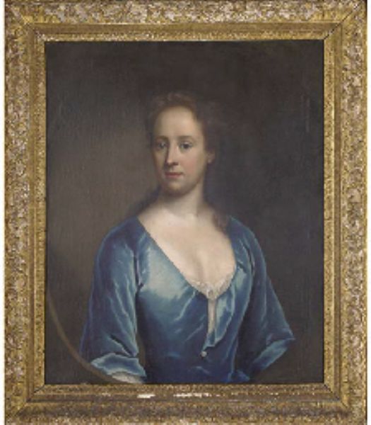Portrait of a lady, quarter-length, in a blue dress, feigned oval