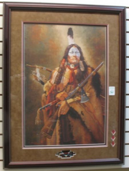 | An American Indian in full costume with war paint and weapons | |