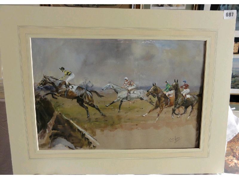 | a horse racing scene with four horses approaching a jump | |