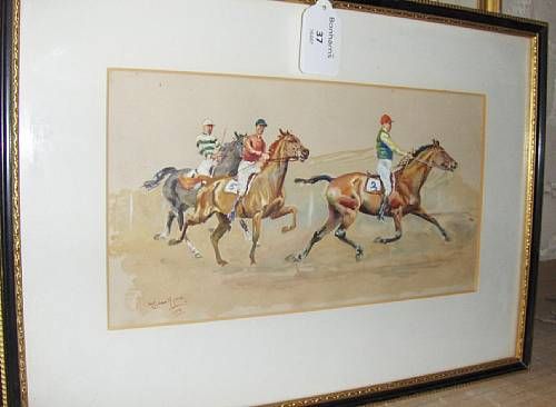 Three racehorses with jockeys up