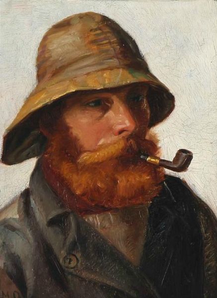 Red-bearded fisherman with a yellow souwester smoking a pipe