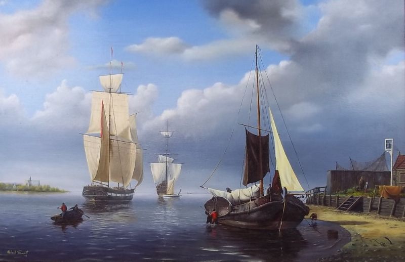 A Dutch shipping scene with a three mast ship and frigate in an estuary