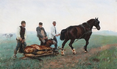 A dead horse is dragged from the field