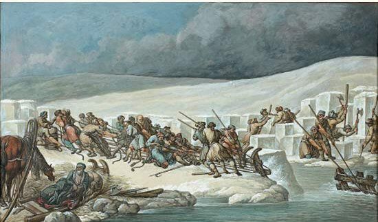 | Russes occupés à briser et à enlever des blocs de glaces | |