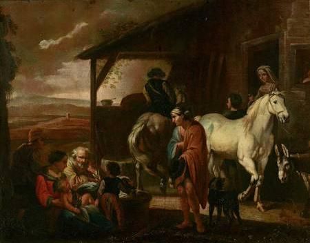 Rastende vor einer Locanda mit Pferden, Esel und Bettler