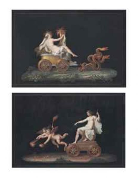| Ceres on a chariot drawn by serpents; and Persephone on a chariot drawn by putti with flaming torches | |