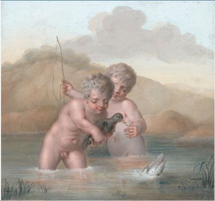| Une paire : enfants jouant dans l’eau avec des canards, enfant à la corbeille fleurie et amour | |