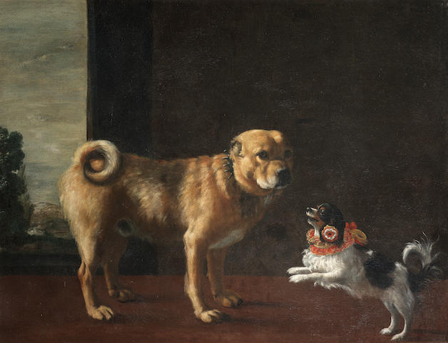 A Mastiff and a Tricolour Cavalier King Charles Spaniel in a landscape