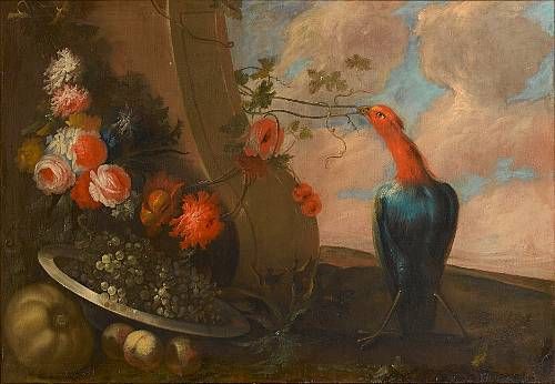 | A peahen beside a stone column with a basket of grapes, peaches and pomegranates with pears and other fruit in a landscape; and | |