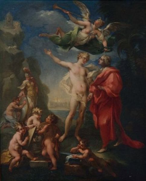 Apollo conducting a patron of the Arts to the Temple of Fame