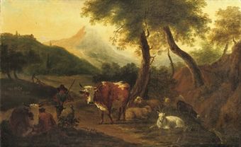 | A herdsman with his flock in a wooded Italianate landscape | |