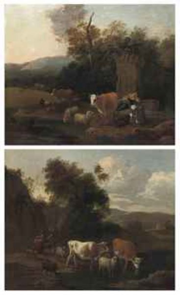 | A wooded landscape with a drover and her cattle at rest by classical ruins; and A wooded river landscape with a drover and his c | |