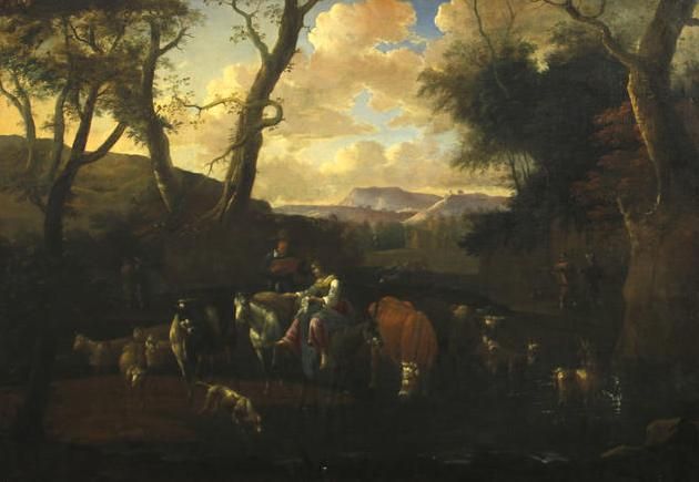 An extensive landscape with cattle and figures by a stream