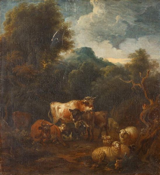 CATTLE, SHEEP, GOAT AND DONKEY IN A WOODED LANDSCAPE