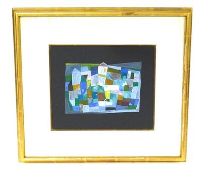 monogrammed "MG" LR, geometric composition depicting cluster of abstracted houses, cool pastel palette, inscribed "8667" in pencil verso, minor flaking to gilt frame, minor blemish in left margin, not examined out of frame, ss: 8" h. x 9 3/4" w. [Glo | |