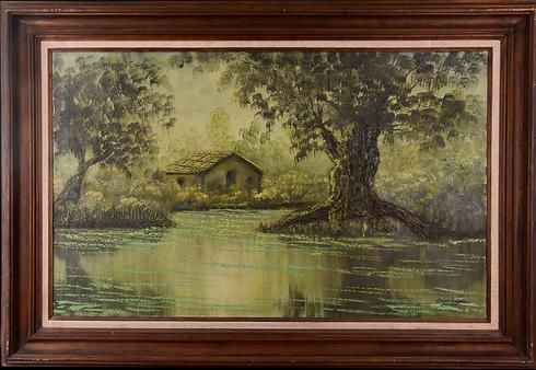 Paisaje con cabaña y lago.