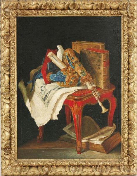 STILL LIFE WITH BAGPIPES AND PAINTED STOOL