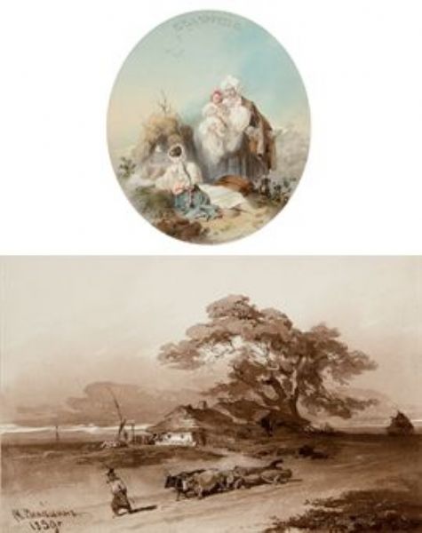 | Pencil and watercolour, one heightened with white, on paper, the first oval | |