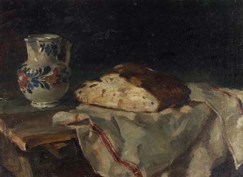Stilleben mit Krug, Brot und Tuch,