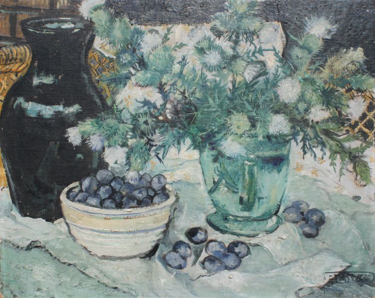 Still Life With Pottery, Blueberries and Floral Bouquet on a Tablecloth