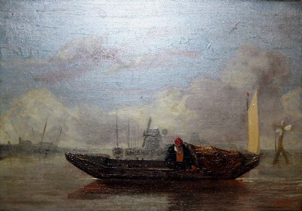 Estuary fishermen with net in barge, windmill in the background