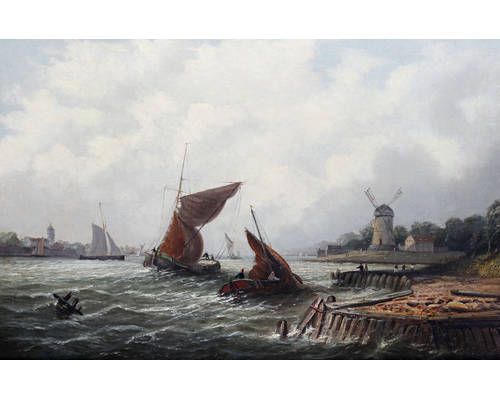 | A wherry and other boats moored in an estuary; Shipping in choppy waters, a pair | |