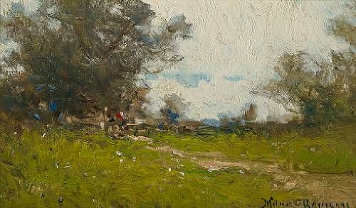 | Meadow path; Ships at harbor; Thatched cottages; Summer landscape (4) each signed 'Milne Ramsey' (lower right) and titled (on th | |