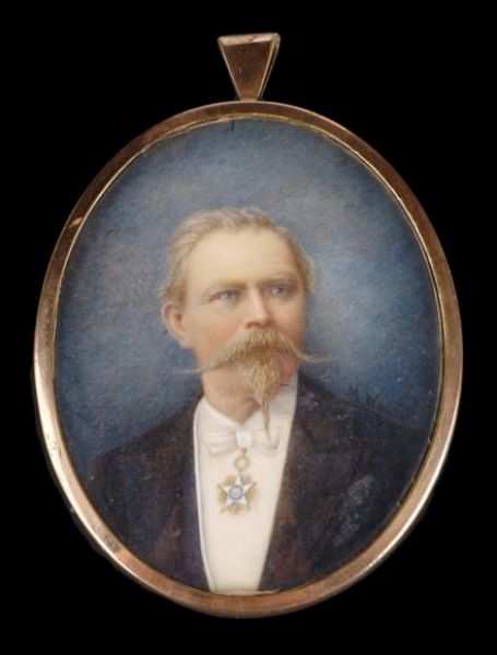 | Portrait of a gentleman with moustache and beard wearing a black coat, a white shirt, a bow tie and a neck award | |
