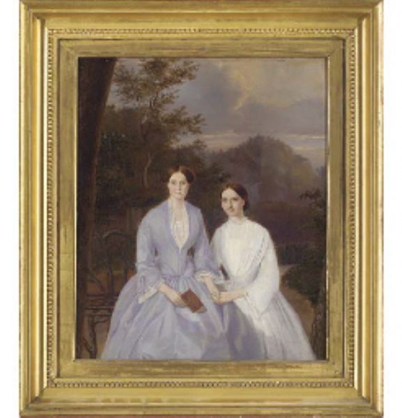 | Portrait of Mmes William and John Barber, three-quarter-length, one holding a book, seated on a garden bench, a landscape beyond | |