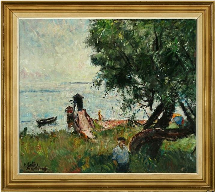 | Landscape with persons and rowing boats at a bathing jetty | |
