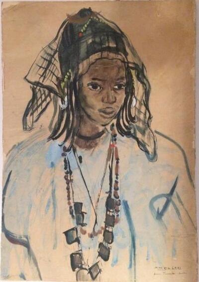 Dessin aquarelle sur papier contrecollé sur carton, signé en bas à droite et titré "Femm Ta????? - Soudan" | |