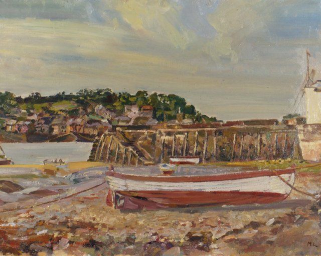 A harbour view with beached rowing boat