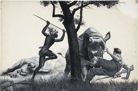 | Zulu Rescue From the Rhinos, My Forty Years In a Jungle World, Hunting Adventures story illustration, Winter, circa 1956 | |