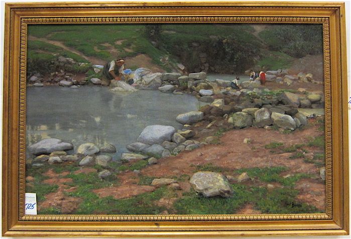 | Four Italian women doing laundry in river pools using boulders as wash boards | |