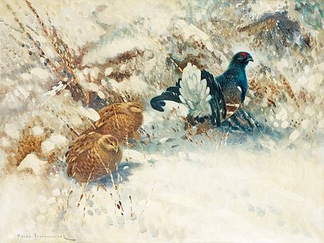 Winter landscape with blackcock and hens