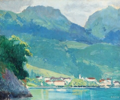 | Mountainous landscape with a town nestled on a lake | |