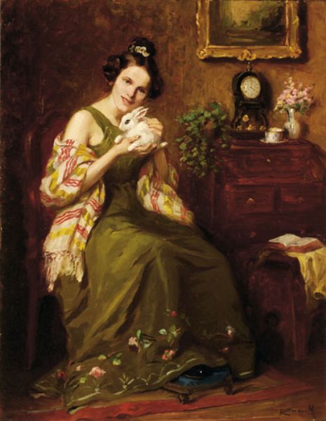 Dame met een konijntje in een interieur