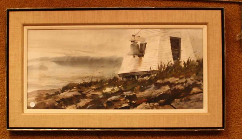 Wyeth-style seascape with the base of a lighthouse and a storm bell