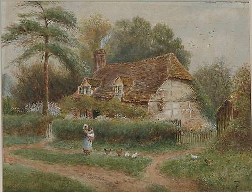 Figures and chickens before a country cottage