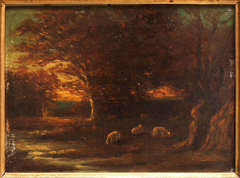Drei Schafe im Laubwald im Licht der untergehenden Sonne