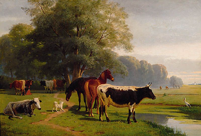 Kühe und Pferde auf der Weide, dazu ein kleiner Hund, ein Storch und eine melkende Magd