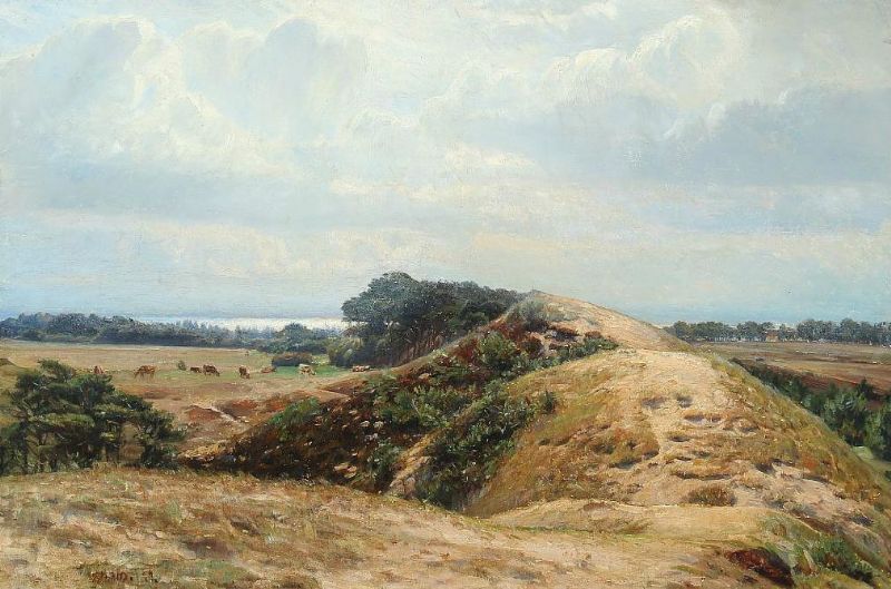 Landscape with view towards the sea and cows grazing in a field