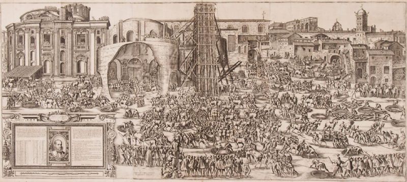 Raising the obelisk in front of St Peter's Basilica in Rome