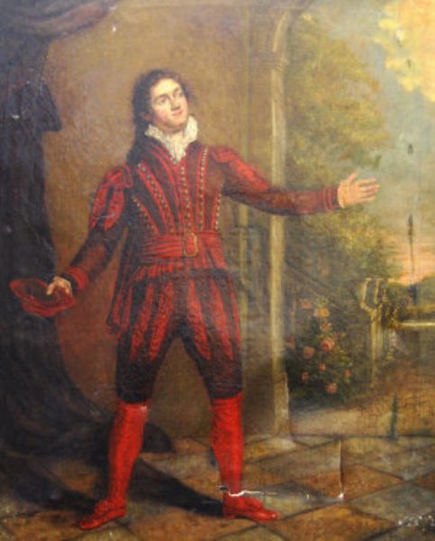| Portrait of an actor standing full-length by an archway to an ornamental garden | |