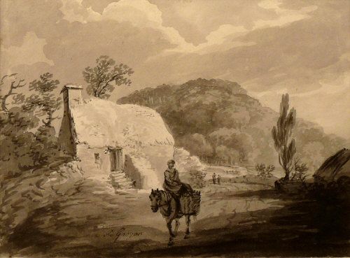 A LADY RIDING A HORSE NEAR A COTTAGE