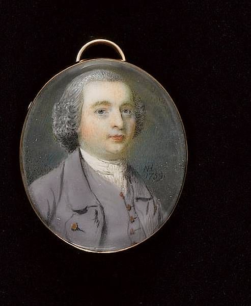 A Gentleman, wearing mauve coat, matching waistcoat, white chemise, cravat and bag wig.