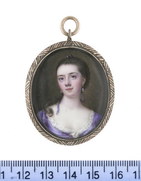 | A Lady, wearing violet dress with white lace slip, her hair upswept and tied with a violet ribbon, pearl pendent earrings. | |