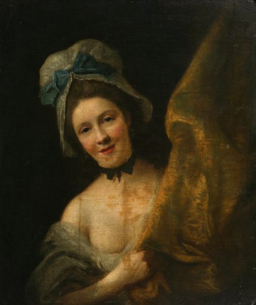 Portrait of a Young Lady, wearing a Bonnet with blue Ribbon, half length by a drape