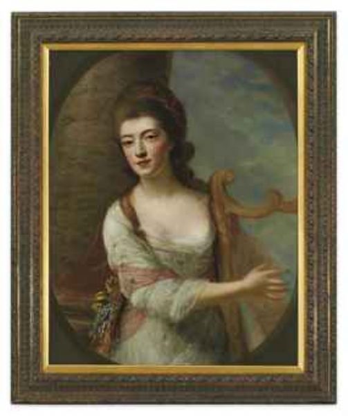 | Portrait of a lady, three-quarter-length, in a white dress, playing a harp, standing by a column in a landscape | |
