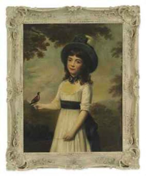 | Portrait of Miss Gardner, three-quarter-length, in a white dress with a blue sash and a hat, a bird on a string perched on her r | |
